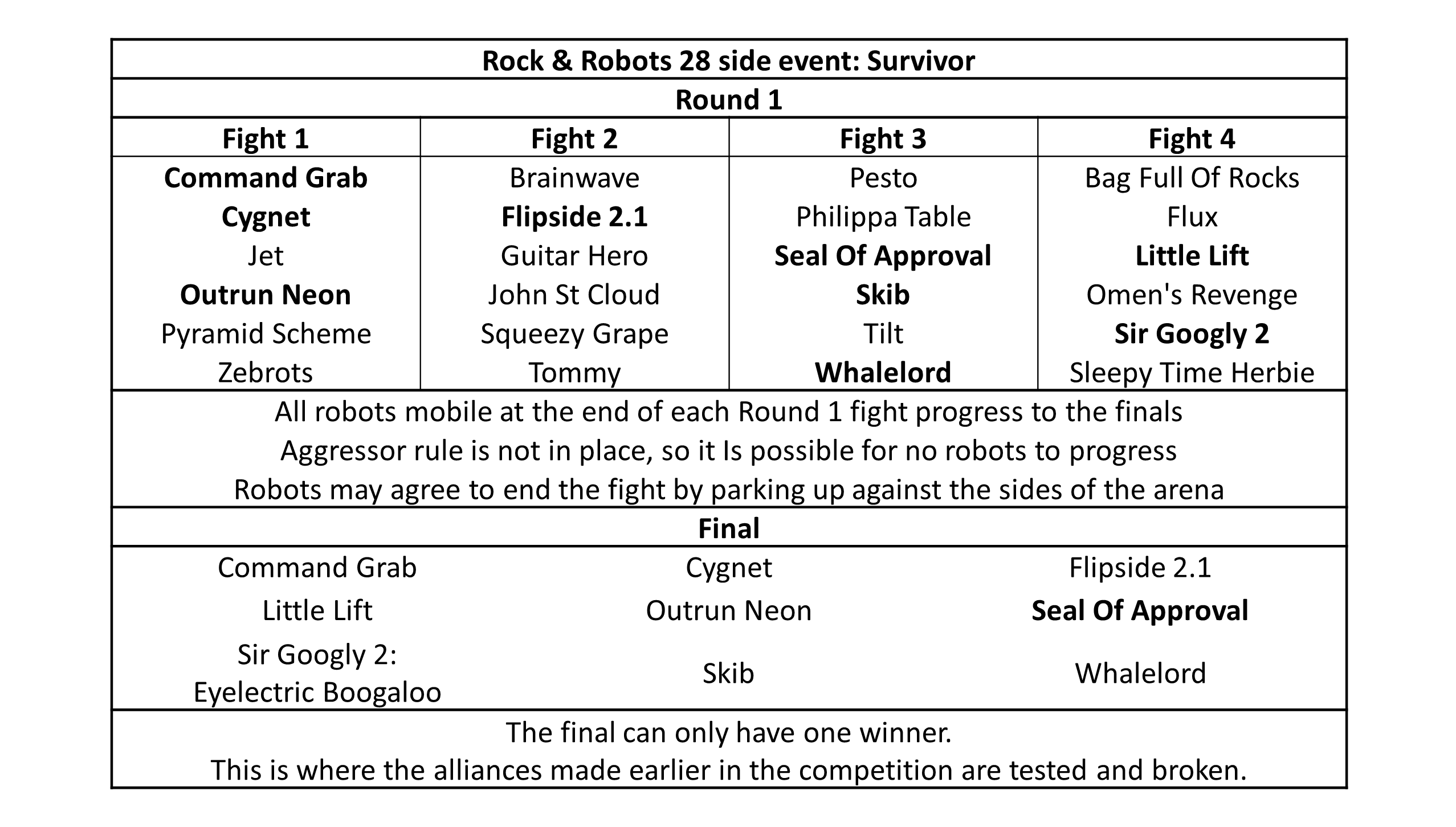 23 | 14/09/2025 | 24 | Little Lift Mike Stevens | Angler Merkel Mk2 Ziggy Frize | Farrago Phoenix Will | Little Lift Mike Stevens | video | ||