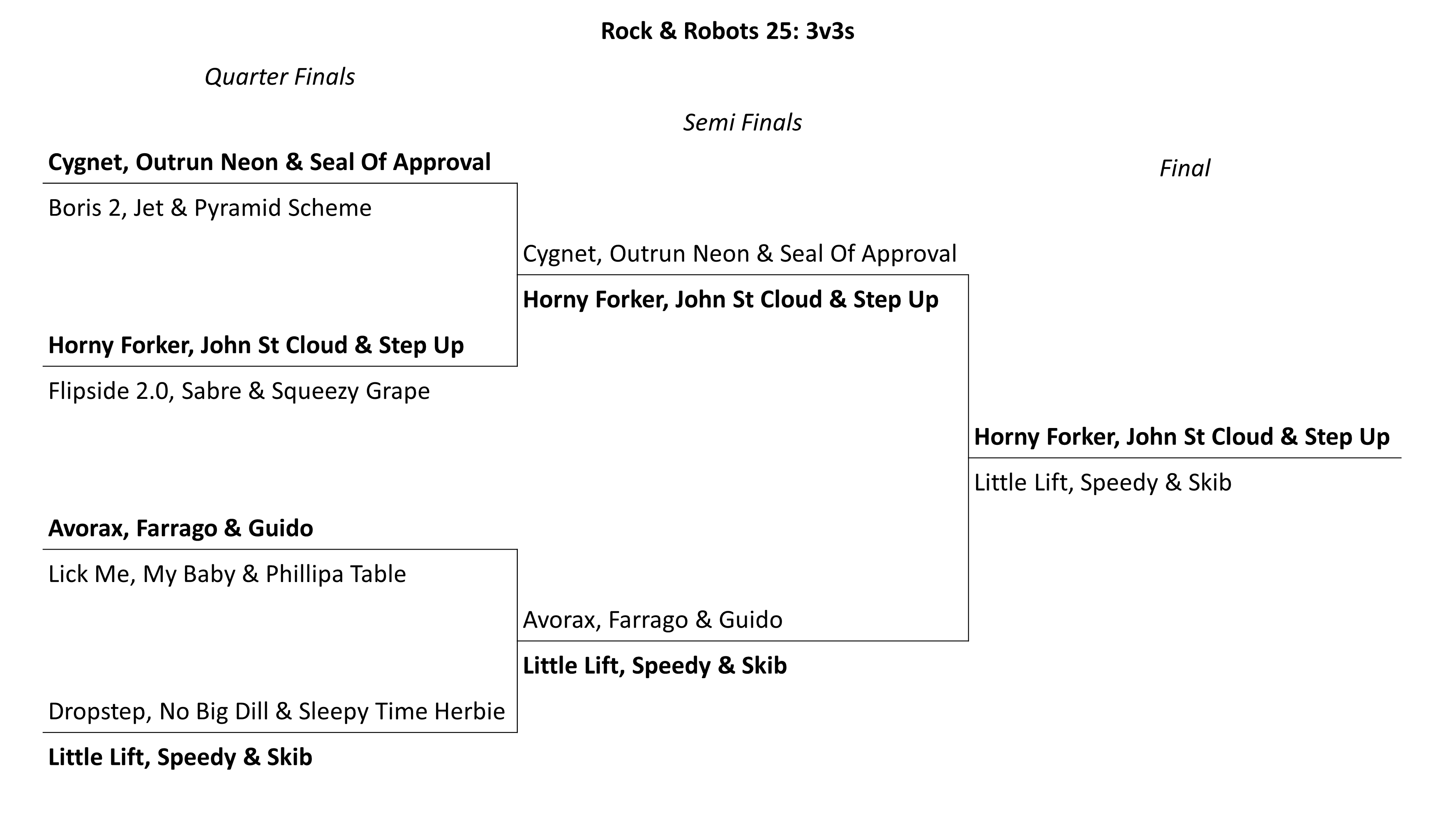 25 | 3v3 tournament | 09/11/2025 | Horny Forker, John St Cloud & Step Up Luke Badgery, Tim Heapy & Eli Gumble | Little Lift, Speedy & Skib Mike, Xavier & Lucinda Stevens | Coming soon | |